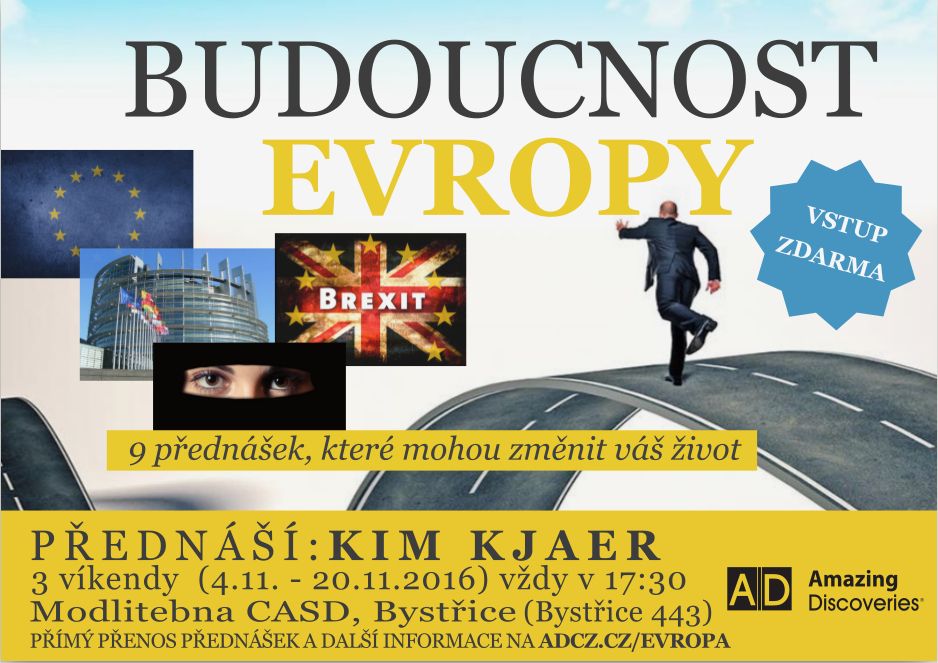 Přijměte pozvání na cyklus přednášek s názvem Budoucnost Evropy. Můžete se těšit na zajímavá témata v podání Kima Kjaera. Přímý přenos z bystřického sboru Církve adventistů sedmého dne budete moci sledovat v pátek 4. listopadu 2016 od 17.30 na BibleTV.