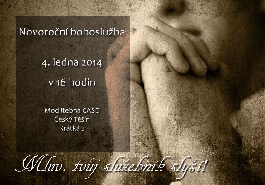 Přijměte pozvání na novoroční Bohoslužbu ze sboru v Českém Těšíně s mottem Mluv, tvůj služebník slyší!. Nad Božím slovem se zamyslíme Richard Medřický. Těšit se můžete na bohatý program v podání dětí českotěšínského sboru. Bohoslužbu bude možné sledovat on-line v sobotu 4. ledna 2014 od 16.00 hodin na BibleTV
