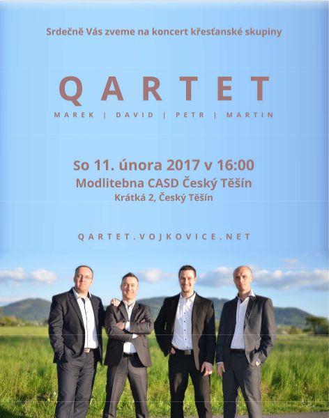Přijměte pozvání na koncert křesťanské skupiny QARTET, který se uskuteční v sobotu 11. února 2017 od 16 hodin. Sledujte on-line na BibleTV