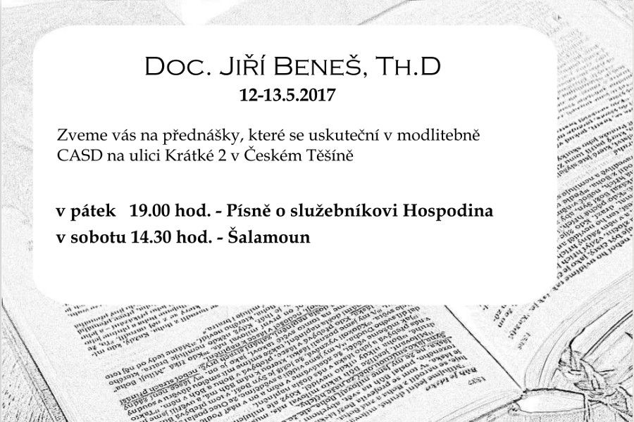 Zveme Vás na cyklus přednášek Doc. Jiřího Beneše, Th.D, které se uskuteční ve dnech 12.-13. května 2017 v modlitebně Církve adventistů sedmého dne v Českém Těšíně. Přednášky budou vysílány on-line na BibleTV.